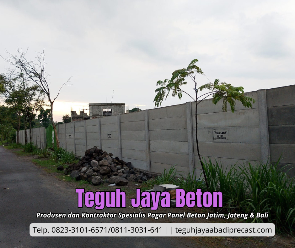 Sebagai produsen dan kontraktor pagar panel beton, Kami siap memenuhi kebutuhan pagar panel beton Anda. Dengan pengalaman yang terbilang cukup di bidangnya Teguh Jaya Abadi Precast siap melayani Anda dengan sepenuh hati. Jaminan kualitas produk dan pelayanan yang prima menjadi motivasi andalan dari Teguh Jaya Abadi Precast. Teguh Jaya Abadi Precast melayani jasa penjualan dan pemasangan Pagar panel beton untuk area Jawa Timur, Jawa Tengah dan Bali. Jangan ragu lagi segera order produk di Kami…