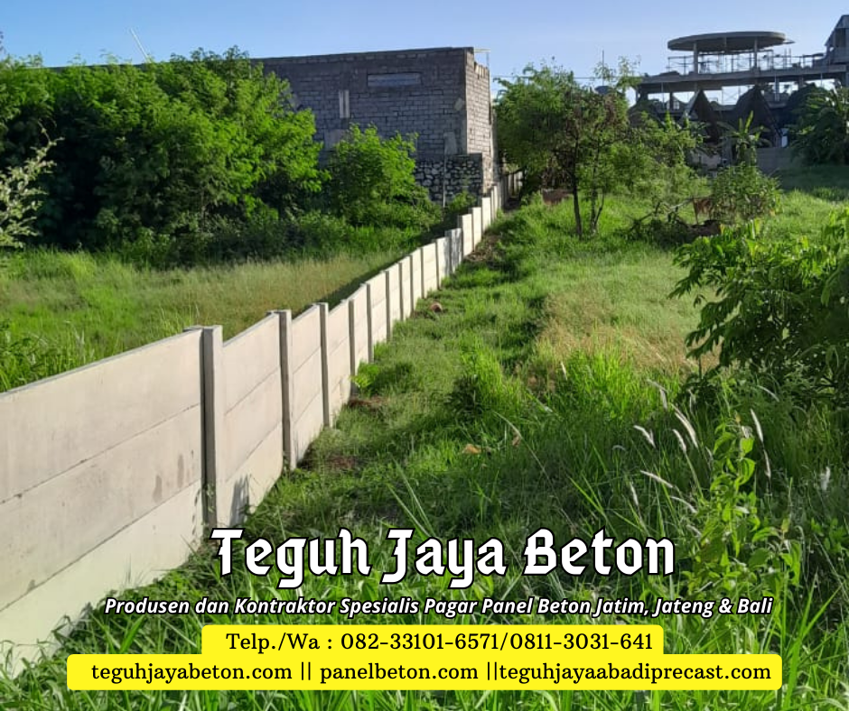 Sebagai produsen dan kontraktor pagar panel beton, Kami siap memenuhi kebutuhan pagar panel beton Anda. Dengan pengalaman yang terbilang cukup di bidangnya Teguh Jaya siap melayani Anda dengan sepenuh hati. Jaminan kualitas produk dan pelayanan yang prima menjadi motivasi andalan dari Teguh Jaya. Teguh Jaya melayani jasa penjualan dan pemasangan Pagar panel beton untuk area Jawa Timur, Jawa Tengah dan Bali. Jangan ragu lagi segera order produk di Kami….